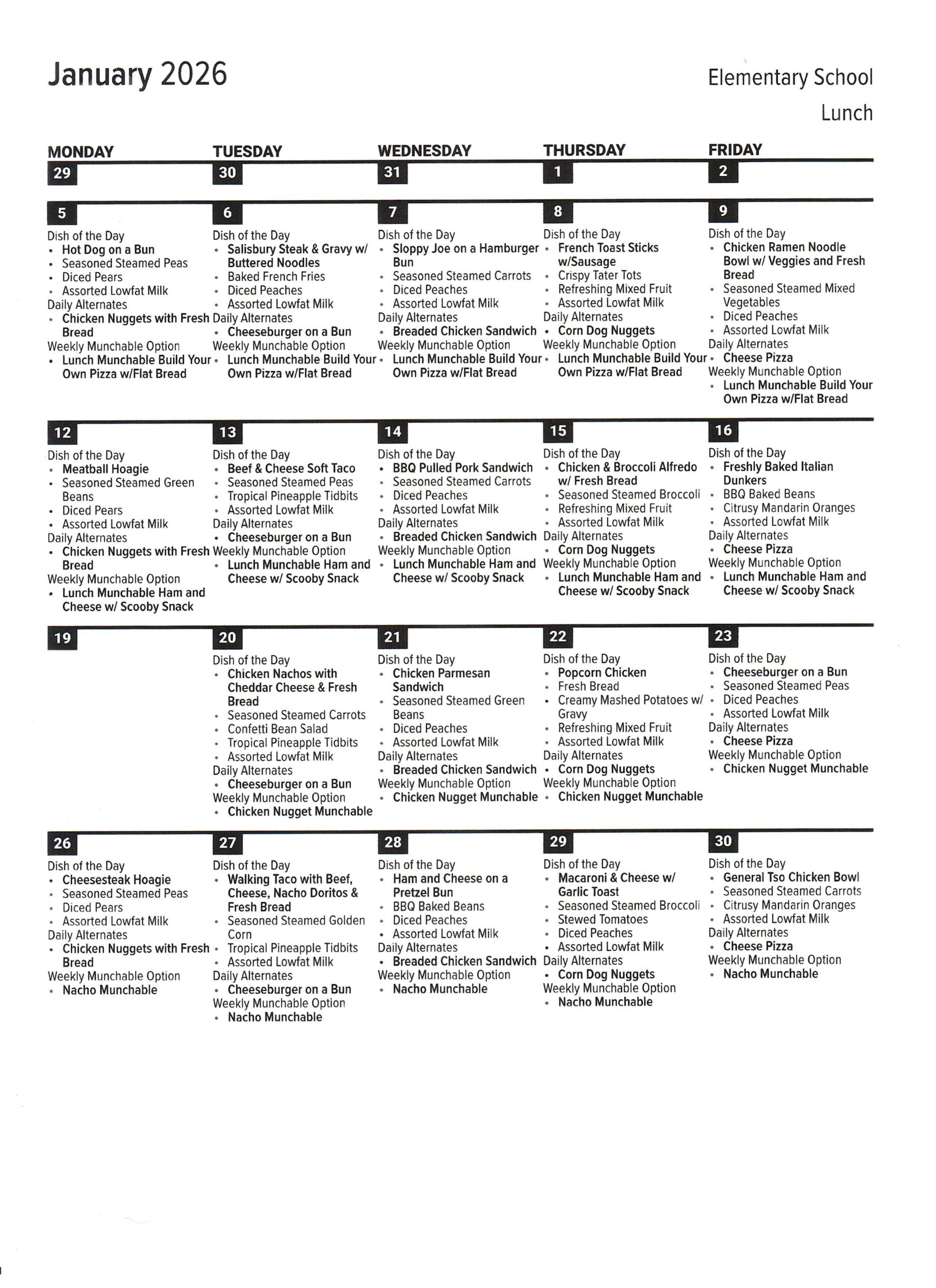 Ala carte foods that are available for purchase by students during the school day are 1% or skim milk, 100% juice, and snacks that comply with federal guidelines.