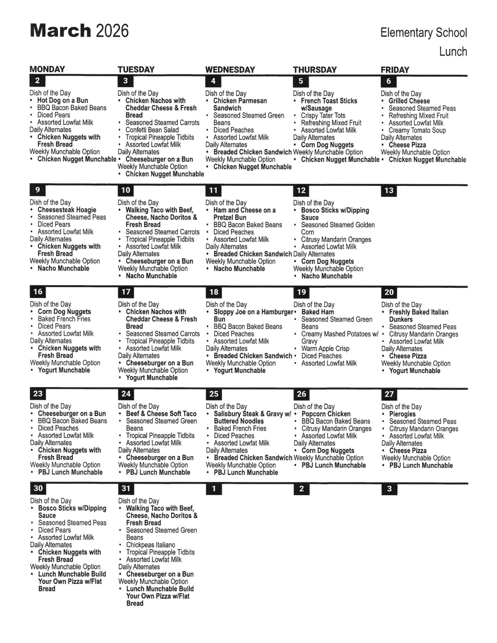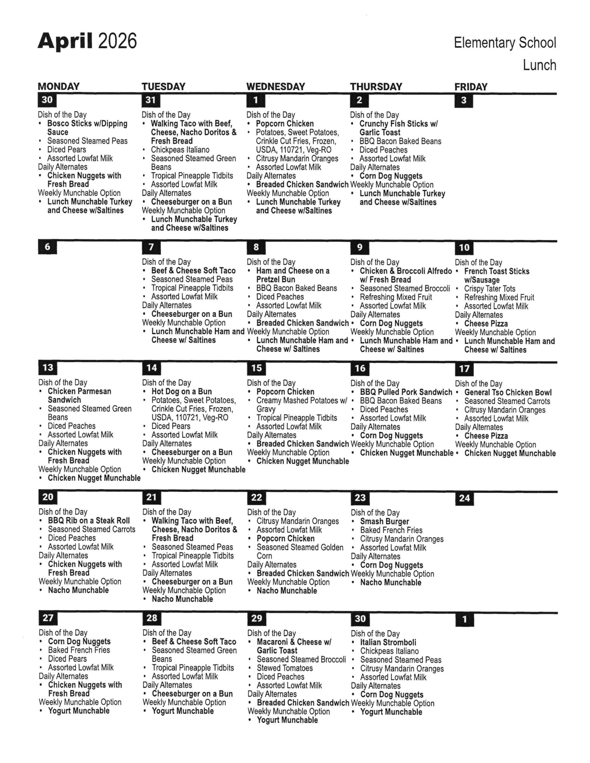 In keeping with the Federal and State mandated nutrition guidelines, students that purchase a lunch from Saint Benedict Food Services will receive meals containing the following items in the specified amounts. Amounts shown in the table below are based on a menu designed for 5 meals within one week.